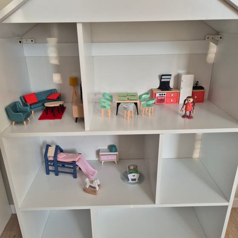 Två stycken fina och praktiska bokhyllor för barnrum säljes. Varje hylla har tre fack för böcker upptill och två förvaringslådor i tyg nertill. Därmed rymmer varje hylla mycket!