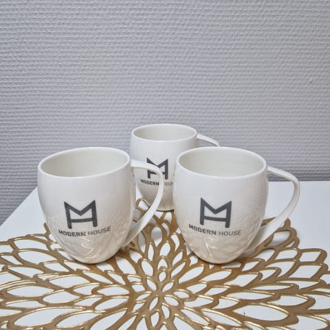 Kaffemuggar i vitt porslin med tryckt text. Muggarna har rund form och är avsedda för dryckesbruk.