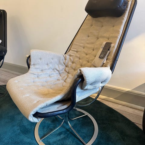 DUX Jetson fåtölj i vit läder med kromad metallbas. Designad av Bruno Mathsson, denna fåtölj har en hög rygg med nackstöd och knappar i stoppningen. Passar för vardagsrum eller kontorsmiljöer.
