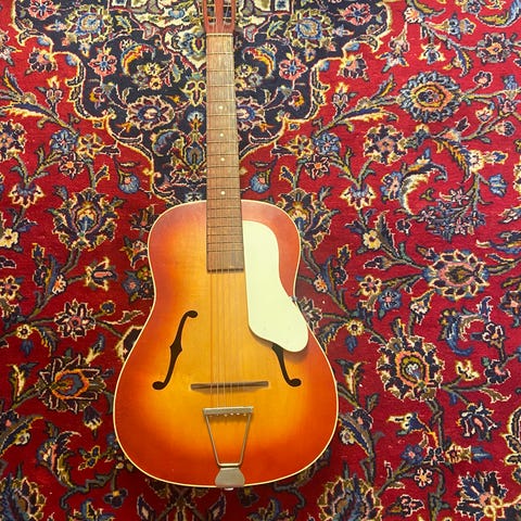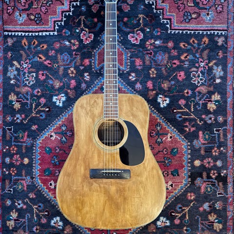 Klassisk modell med svart, rundad botten i typ komposit- eller plastmaterial. Gitarren är byggd i Korea, troligen på 70 eller 80-talet och har fungerande inbyggd mik. Inget fodral medföljer. Hämtas i Linköping