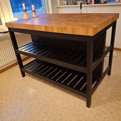 Möbeln är stabil och lådorna fungerar felfritt. Det finns kosmetiska skador/märken på stommens vänstra sida (se bild) samt spår av användning på bänkskivan. Skadan på sidan döljs enkelt om modulen placeras mot en vägg eller kylskåp, alternativt om man monterar en ny täcksida.