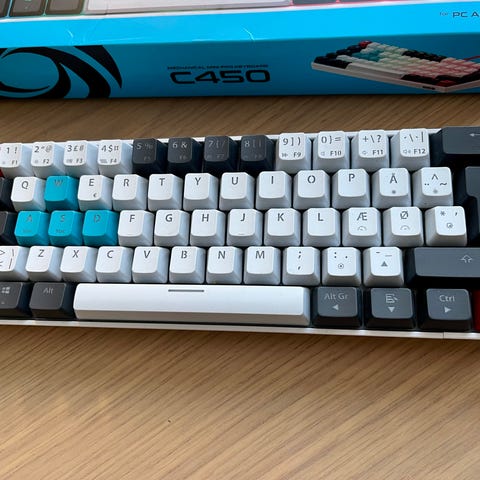 NOS C450 Mini Keyboard Pro RGB tangentbord med kompakt design och RGB-belysning. Tangentbordet är trådbundet och levereras med extra tangenter och verktyg för att byta ut dem.