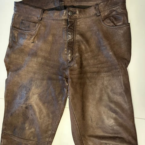 Svarta läderbyxor i unisexmodell. ( dam) Byxorna har rak passform och två bakfickor. Materialet är läder, vilket ger en slitstark och hållbar egenskap. Storlek 38. Dragkedja nedtill på benen.. Använd 1 gång! Sedan viktuppgång 😀 Nypris ca 6000kr