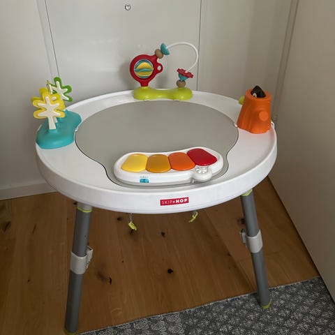 Från Jollyrooms hemsida: Detta aktivitetscenter ur serien Explore & More från Skip Hop har tagits fram i samarbete med barnläkare för att vara speciellt anpassat för ditt barns utveckling och välmående. Aktivitetscentret är utrustat med 25 pedagogiska aktiviteter, däribland blinkande musikpiano, tittut-uggla, skallrande moln med färgglada pärlor och bitvänliga träd. En matskål med sugpropp medföljer. Sittdelen kan roteras i 360 grader och dess elastiska tyg låter ditt barn studsa. Fotstödet är höjdjusterbart. Leksakerna sätts fast på lekbordet på valfri plats efter tycke och smak, och när ditt barn blir äldre kan du helt ta bort leksakerna och sittdelen för att göra om aktivitetscentret till ett bord där ditt barn kan leka och pyssla. Benen är avtagbara för smidig förvaring. Ett aktivitetscenter som ni kan ha stor glädje av länge!