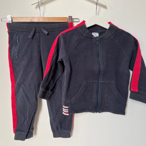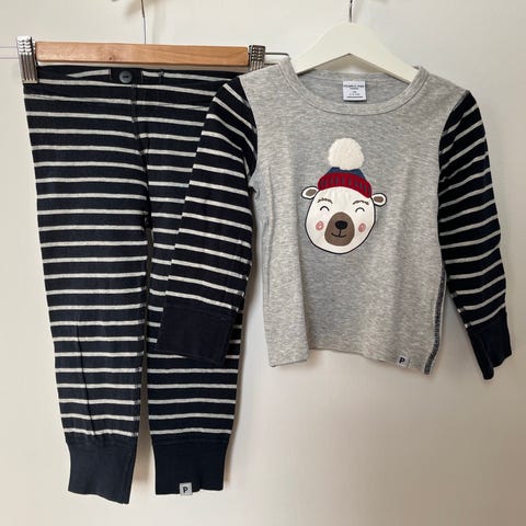 Polarn O. Pyret barnkläder i storlek 104 med flerfärgat mönster. Setet består av långärmad tröja och byxor med tryck av olika fordon.