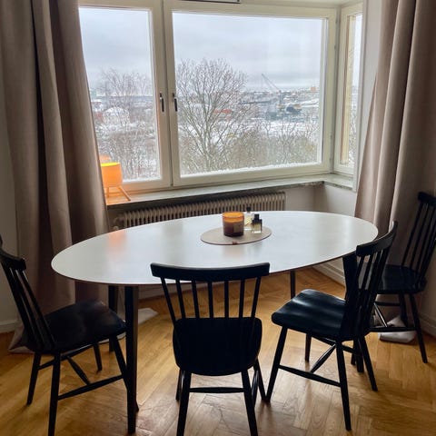 6 vitlackade pinnstolar i trä från EM-möbler medföljer (har lite lacksläpp/skav här och där)