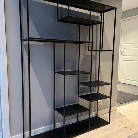 Svart hylla i metall med flera nivåer och öppen design. Passar för förvaring och visning av olika föremål i hemmet, från Bruka Design. B 80 H.80 Dj.12 cm Originalpris ca 1.400:-
