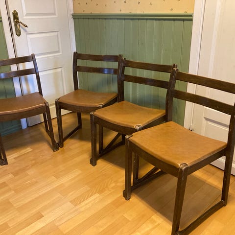 Stolarna är i gott begagnat skick, men har några mindre repor och märken i träet (se bilder). Inget som påverkar användning – ger bara extra vintagekänsla.