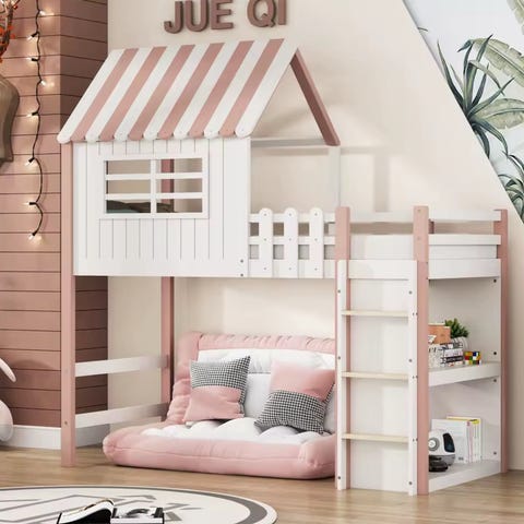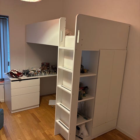 Säljer 2 st IKEA Loftsäng i vit björk med skrivbord och garderob. Den ena i rosa detaljer och den andra i blå detaljer. Sängen är utformad för att spara golvyta och skapa plats för skrivbord eller förvaring under. Passar för barnrum och erbjuder en funktionell lösning för sov- och arbetsplats i samma område.