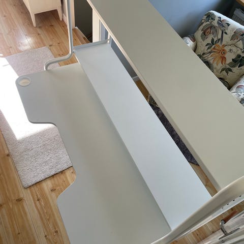 Säljer ett gamingskrivbord som har använts ett tag. Det enda slitaget man ser är de två hålen som är på bild 2 , men annars är stabilt och fungerar precis som det ska. Hålen utgör inte någon större förändring förutom det estetiska.