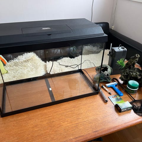 Jag säljer vårt 106 l akvarium med mått djup 36 cm, höjd 38,5 cm, bredd 74,5 cm med doppvärmare, LED belysning, grus och växter och dekorationer. Akvariet har ett starkt metall och plast ram som gör det extra stabilt. Lämpar sig till många olika fiskarter.