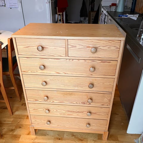Äldre byrå med nya knoppar och nytt inlägg i lådorna (nytt från IKEA), det finns synligt slitage. Finns ingen nyckel till översta lådan.
