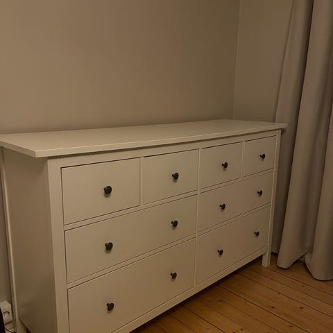Mycket fin och nätt byrå från Mio i gott skick, ett år gammal. Enda slitaget är ett märke på ena sidan, se bild, samt att vi har sågat i "bakkant" efter golvlister för att den ska komma tätt intill väggen. Inget som syns framifrån. Se nypris och mått på första bilden.