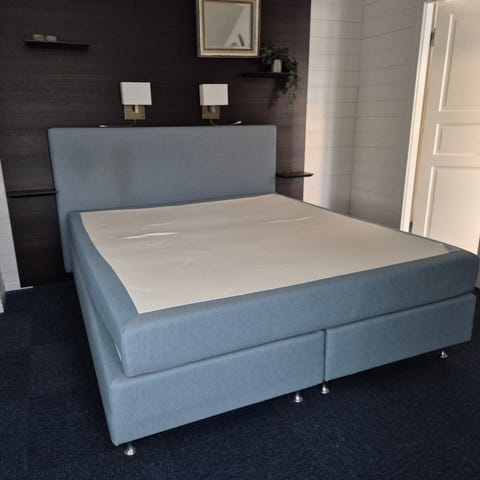 Jättefin o välvårdad dubbelsäng med resårbottenmadrasser och bäddmadrasser.