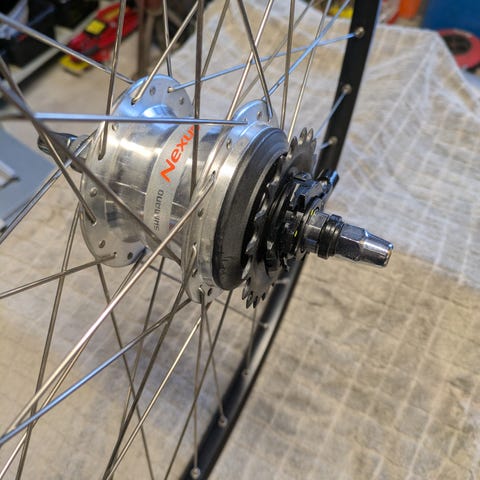 NuVinci N360 nav med integrerat växelsystem. Kommer med Schwalbe Marathon Plus däck i storlek 28 tum (700x35C). Navet är avsett för cyklar och har en silverfärgad yta.