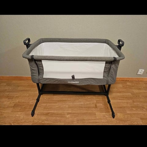 Moweo Bedside Crib är en sängdesignad för att placeras intill föräldrasängen. Den har ett nätmaterial på sidorna för god ventilation och överblick. Sängen är i en neutral färg och är anpassad för småbarn. Samt förvaring under till men går att knäppa ihop om man inte vill använda. Håll finns i näten. Katt finns i hemmet.