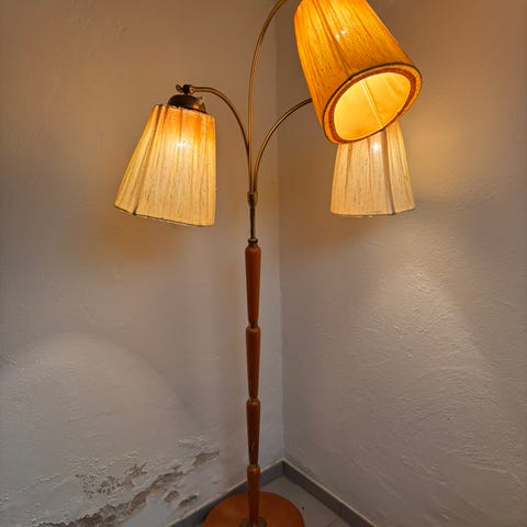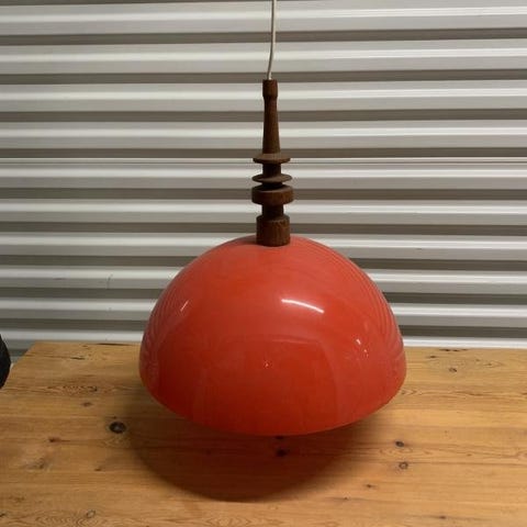 Fullt fungerande retro-taklampa i glas och teak. Med dcl-kabel. Lampan har en varm röd färg (på bild blev den något mer rosa).