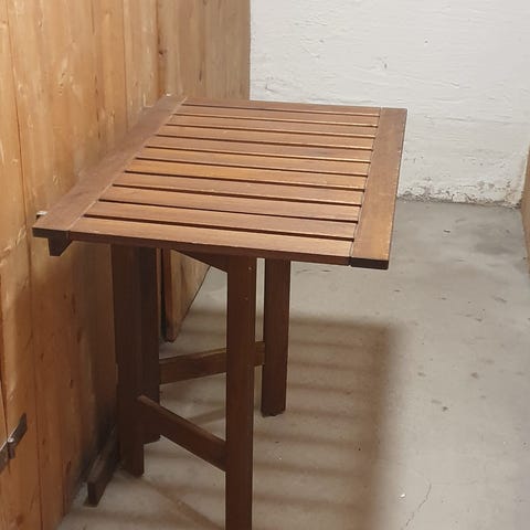 Balkongbord / trädgårdsbord i trä med brun ytbehandling. Bordet har en rektangulär form med rundade hörn.