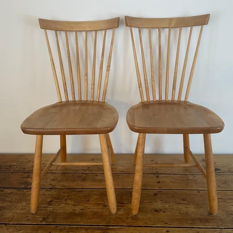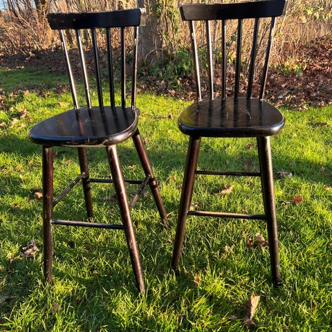 Klassisk pinnstol i massiv bok från ca. 1950/60-tal. Spjälad rygg. Helt stabil och stadig. Ytligt slitage endast bets som skavts bort. Påminner mycket om Carl Malmstens Lilla Åland