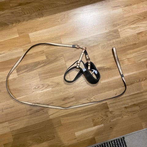 Obetydligt använd, inga skador. Nypris 800 kr. Reflex i koppllet. Längd på kopplet när den inte är sträckt är ungefär 135 cm. I utsträckt läge är den ungefär 215 cm