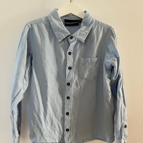 Geggamoja blå kortärmad skjorta i storlek 110/116. Tillverkad i lin och bomull med korta ärmar och knappar framtill.