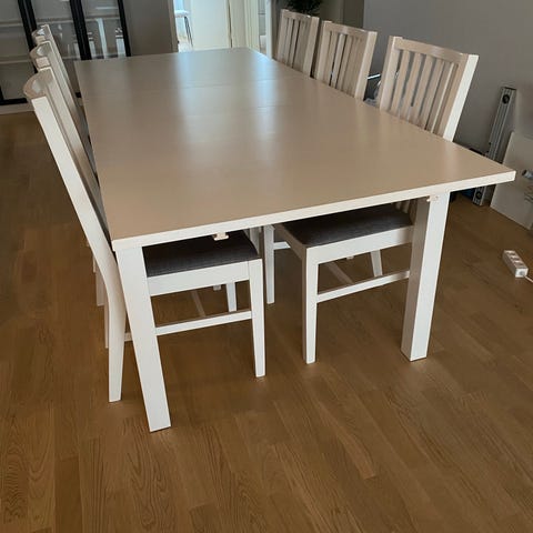 Klassiskt matbord i trä med stolar – utdragbart med iläggsskiva