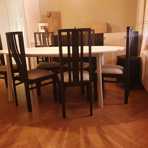 Matbord med stolar i trä med stoppad sits