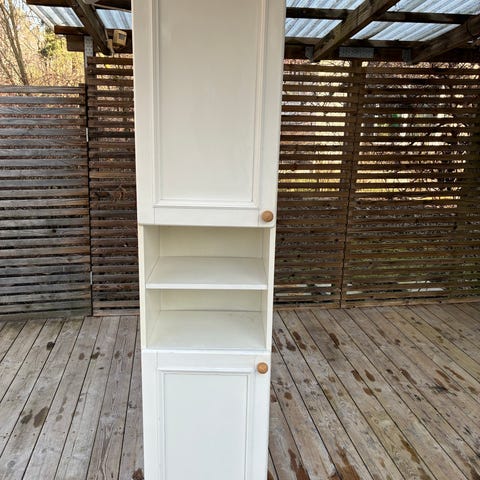IKEA Matt badrumshylla och tvättkorg i trä. Hyllan har fyra hyllplan och är valnötsbrun. Går att placera över toalettstol/tvättmaskin/tvättkorg så perfekt för mindre badrum. 182x68x19