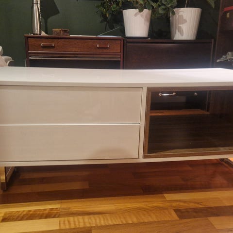 Liten och nätt mediamöbel i gott skick, bredd 120 cm, djup 39 cm, höjd 25 cm, väggfästen/skena medföljer. Köpt på Royal Design.