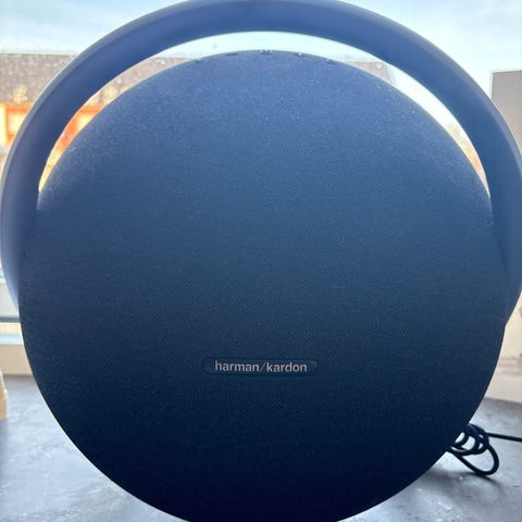 Harman Kardon högtalare i vit färg. Designad för ljudåtergivning med anslutningsmöjligheter på baksidan. Rund form med tre ben för stabil placering.