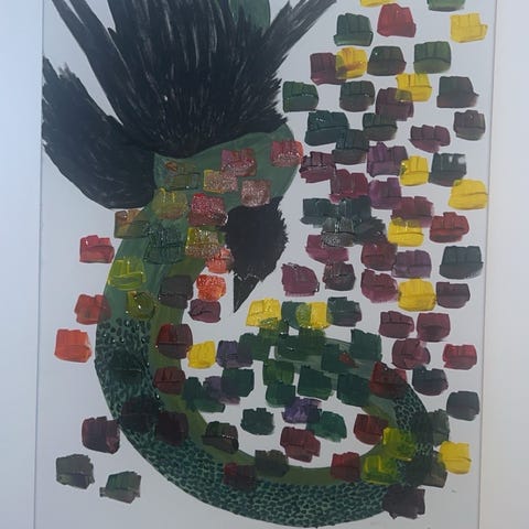 Konstverk med abstrakt motiv i svart och grått. Tavlan visar en central figur med droppande effekter och flera mindre teckningar runt om. Signatur finns i nedre vänstra hörnet. Pris kan diskuteras!!