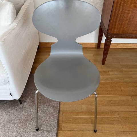Samt två stycken vita myran-stolar med tre ben, nyare tillverkning, fint skick.