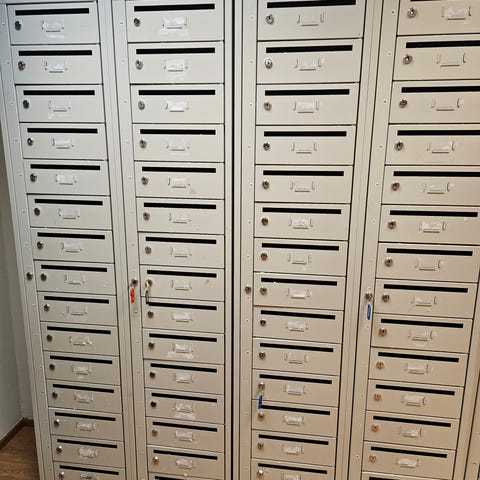 Svart postbox med nyckellås, utformad för säker förvaring av post och små paket. Postboxen har individuella lås för varje fack, vilket möjliggör personlig åtkomst. Tillverkad i metall med en svart finish.