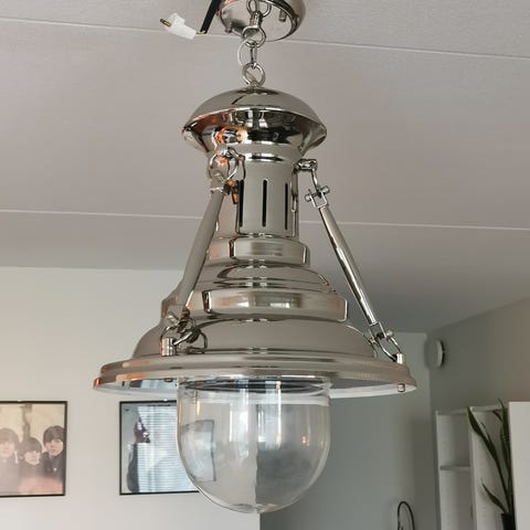 Taklampa Liverpool i metall är en kraftig lampa i industriell design som tar för sig. Taklampan har en 1,2 meter lång kedja och takkupor i samma färg som lampan. Höjd 39 cm diameter 50 cm E27 sockel, max 60 w IP20. Rå mässing.