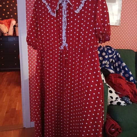 Svart klänning med röda prickar, smala axelband och en åtsittande överdel. Klänningen har en utställd kjol som slutar nedanför knäna.