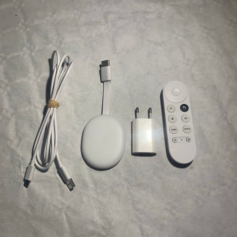 Google Chromecast med fjärrkontroll, vit färg. Enhet för att strömma media till TV med medföljande fjärrkontroll för enkel navigering.