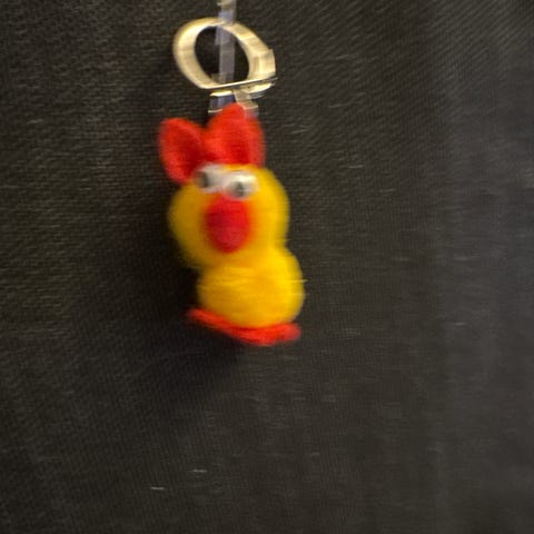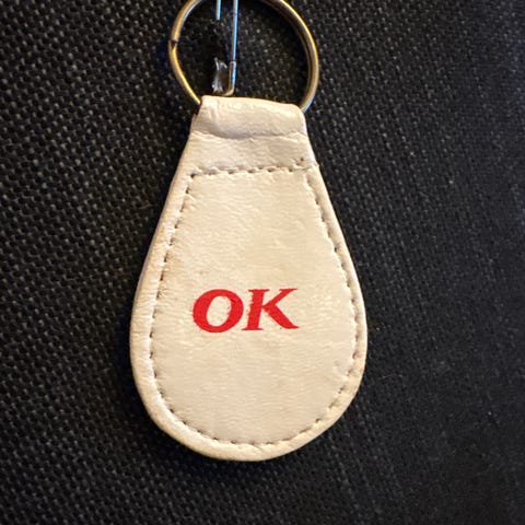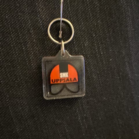 Unisex nyckelring med rund form och brun basfärg. Dekorerad med vita symboler och mönster på framsidan. Tillverkad i ett material med naturlig textur och har en metallring för fäste. Passar för att hålla nycklar organiserade.