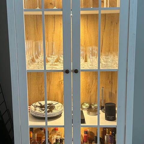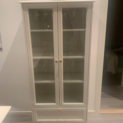 Vit vitrinskåp med dörrar och låda