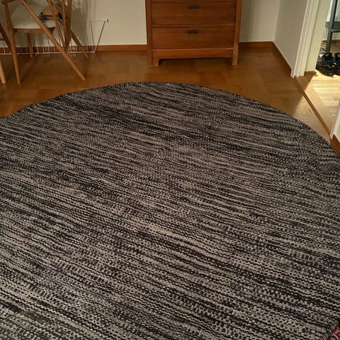 Omkretsen på mattan är 250 cm. Tjock vävd kvalitet i ull/ullblandning. Mycket fint skick, inga fläckar.