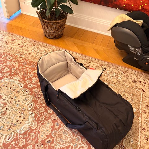 Mjuklift i röd färg. Designad för att bära barn bekvämt och säkert. Tillverkad i slitstarkt material från ett rökfritt och djurfritt hem.