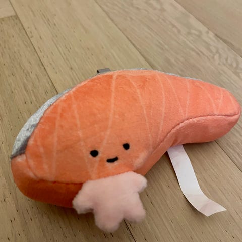 Nyckelring med en röd figur i plast. Figuren har vita detaljer och är fäst vid en metallring med kedja. Produkten kan användas för att hålla nycklar organiserade eller som dekoration.