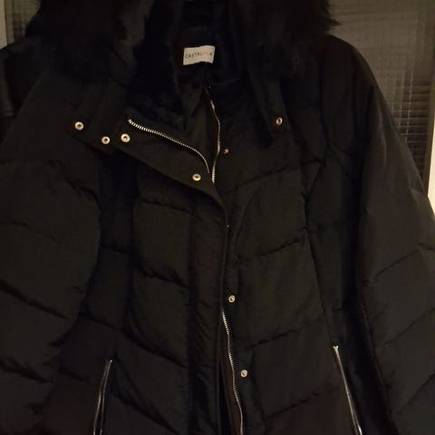 Ny fin,varm täckjacka,pälskantad luva.Svart.