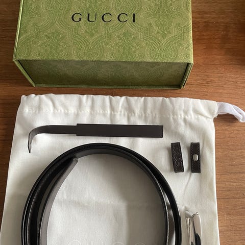 Svart Gucci-bälte i läder med ikoniskt Gucci-monogram. Nypris 7000kr.