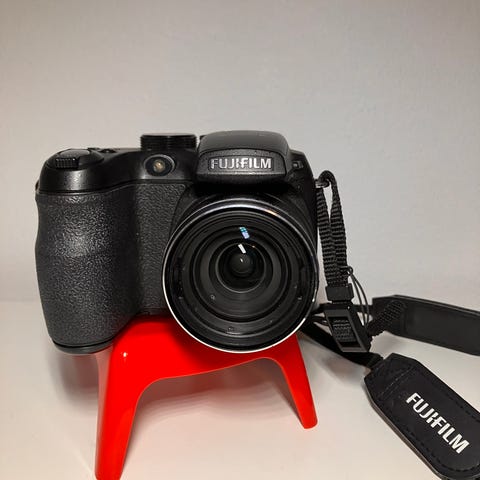 Fujifilm FinePix A 405 digital kamera i färgen silver. Kameran har en kompakt design med inbyggd blixt och en digital display på baksidan för bildvisning och inställningar. Utrustad med en zoomlins och handledsrem för enklare hantering.