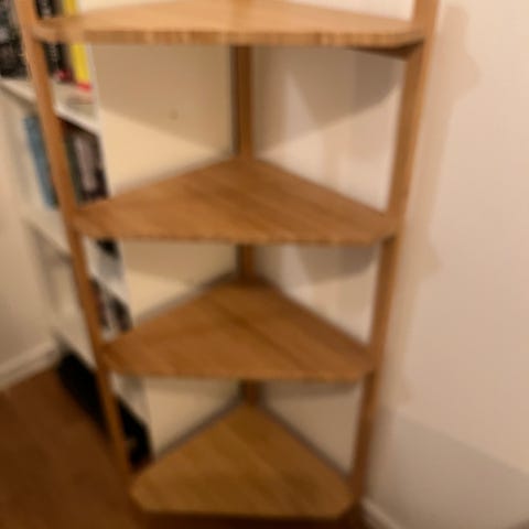 Metall hörnhylla i svart färg med flera hyllplan. Hyllan är utformad för att placeras i hörn