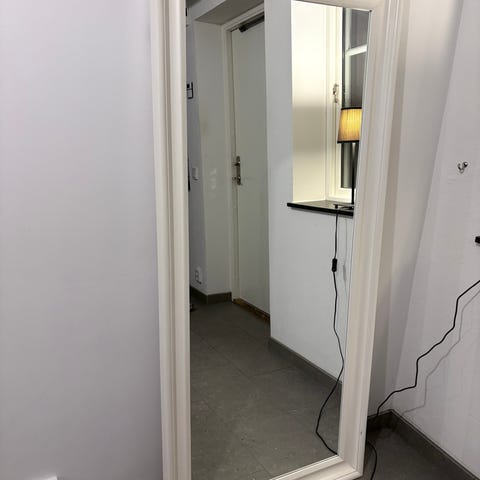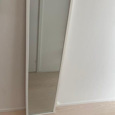 IKEA spegel med vit ram. Spegeln är avsedd för väggmontering men kan även stå på marken.
