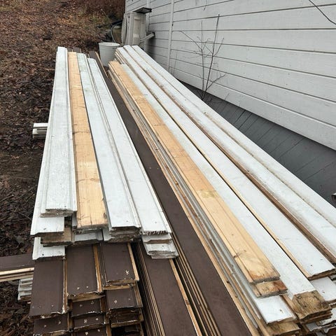 Ett oöppnat paket bastupanel gran från byggmax. 2,4 m långa. Även ett par brädor i öppnat paket över