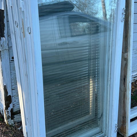 Träfönster med två glasrutor och spröjs. Fönstret är 1-glas och har innanfönster och är av äldre modell. Passar för renovering eller utbyte i äldre byggnader.