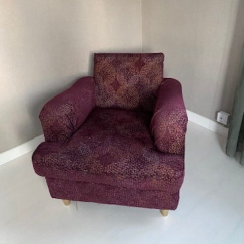 Vinröd fåtölj bortskänkes. Osäker om det är en ”Emma”. Bortskänkes