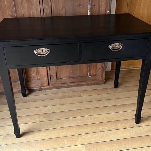 Vintage vitt skrivbord i trä med medföljande hylla och lådor. Finns att hämta i Bara.